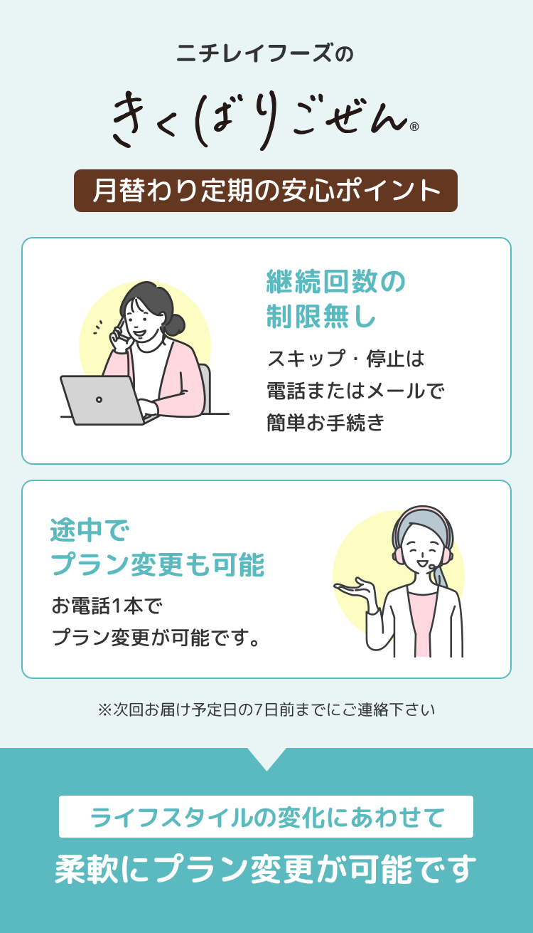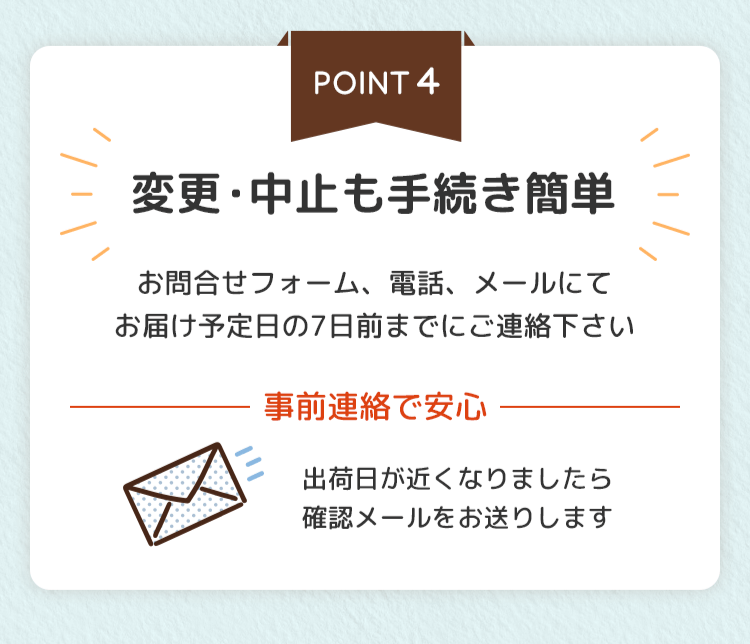 定期購入を終了される場合は、お問い合わせフォームもしくはお電話にてご連絡ください。